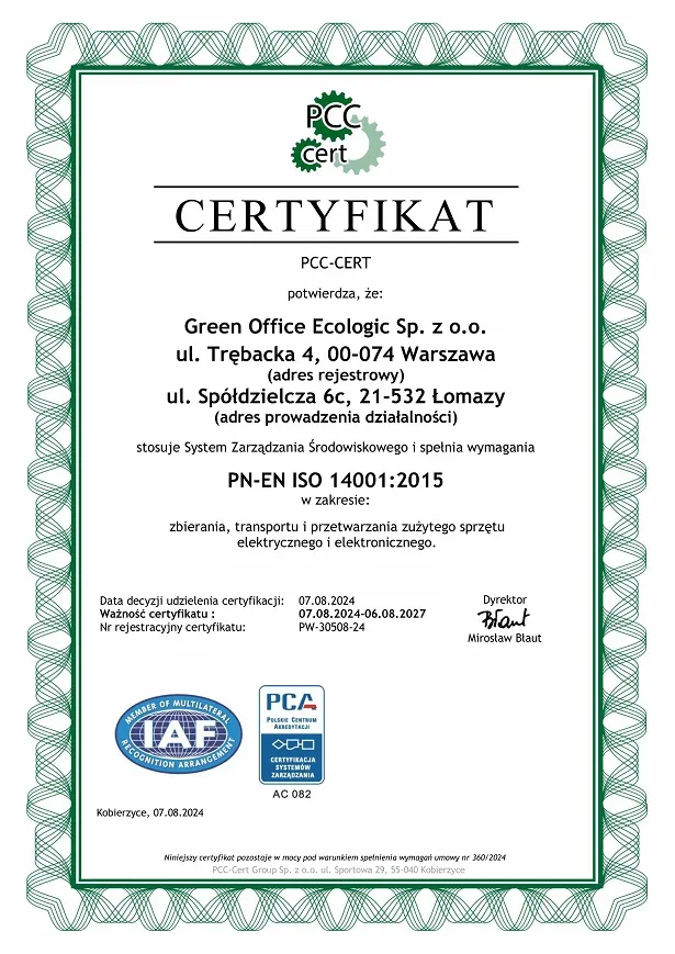 Działając od 2010 roku zajmujemy się zbieraniem i przetwarzaniem zużytego sprzętu elektrycznego i elektronicznego. Każdego roku zbieramy blisko 20 tys. ton szkodliwych elektroodpadów. Nasza praca ma realny wpływ na ochronę środowiska. Od samego początku naszej działalności naszą misją jest także edukowanie społeczeństwa w zakresie ekologii, dlatego angażujemy się w liczne projekty ekologiczno-edukacyjne i społeczne. Posiadamy wszelkie niezbędne zezwolenia oraz certyfikację ISO 14001.